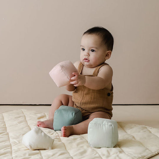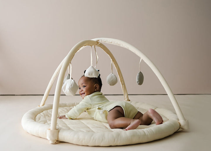 A cushioned, foldable play mat made from 100% organic cotton, designed for safe, comfortable play and sensory exploration